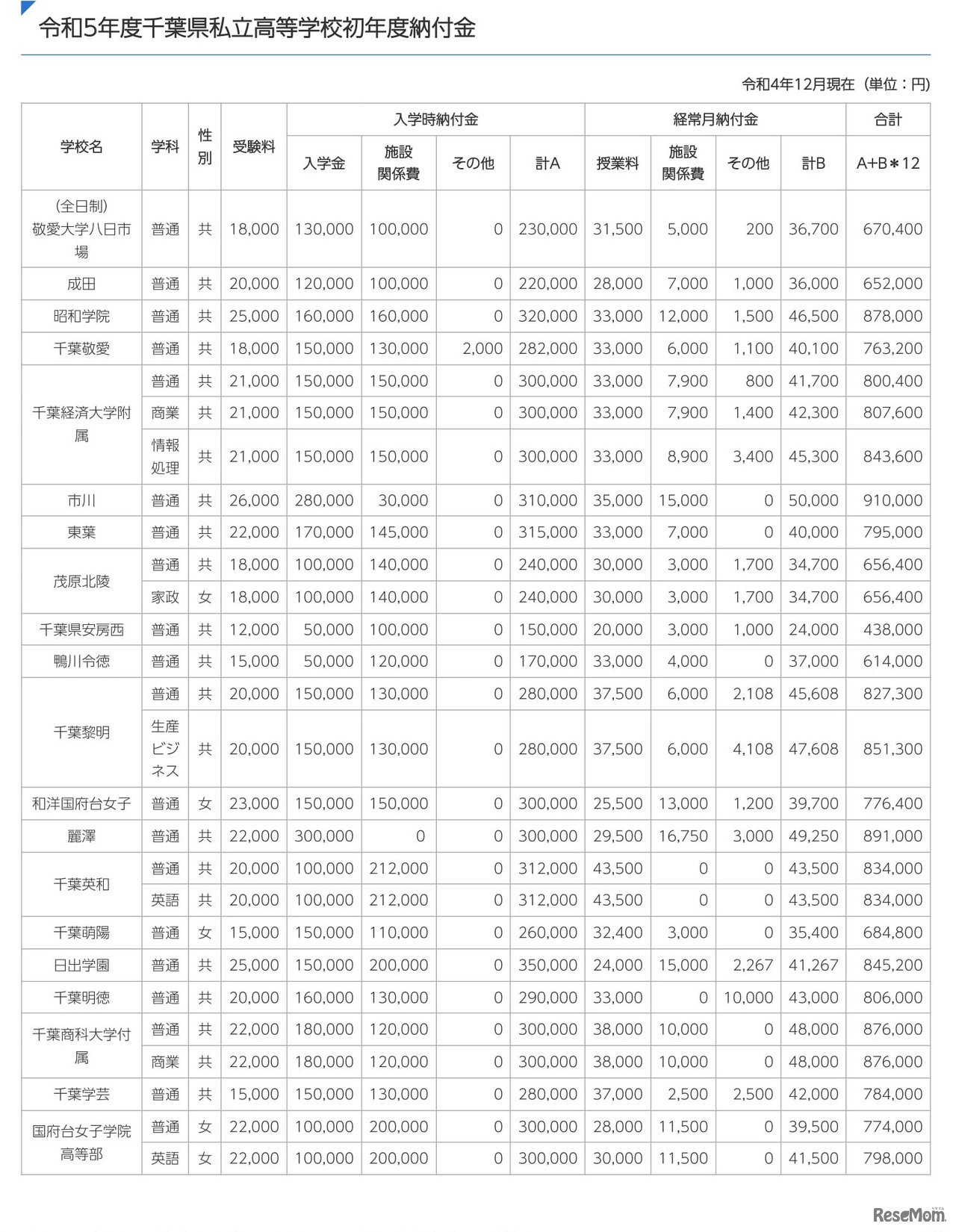 画像出典:千葉県 2023年度千葉県私立高等学校初年度納付金