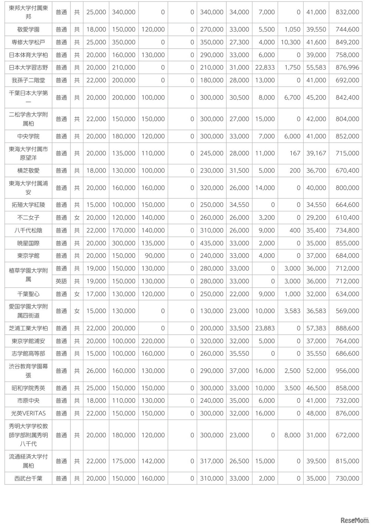 画像出典:千葉県 2023年度千葉県私立高等学校初年度納付金