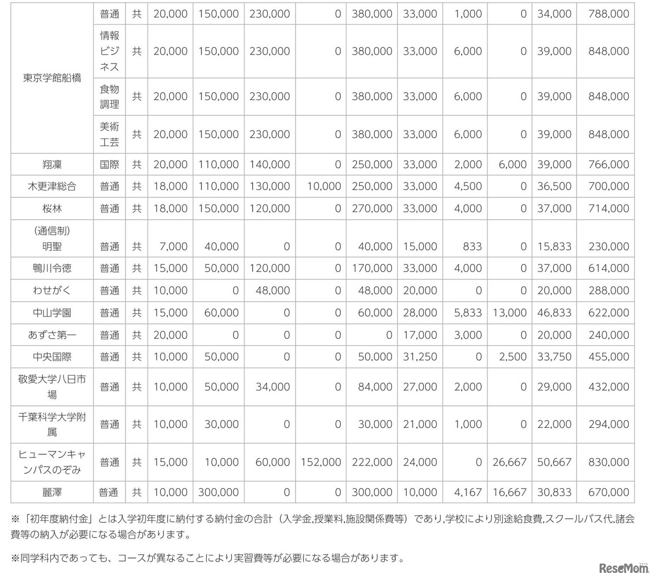 画像出典:千葉県 2023年度千葉県私立高等学校初年度納付金