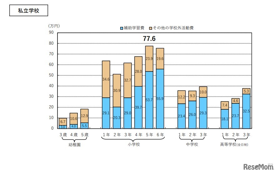 画像出典:文部科学省 私立、学年別にみた「補助学習費」と「その他の学校外活動費」