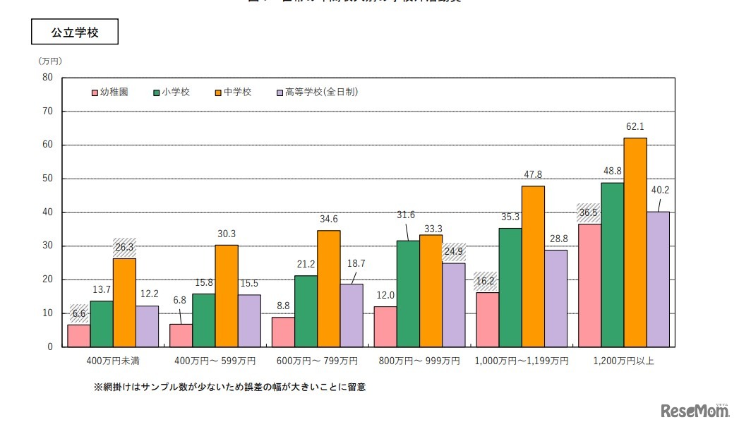 画像出典:文部科学省 公立、世帯の年間収入別の学校外活動費支出状況