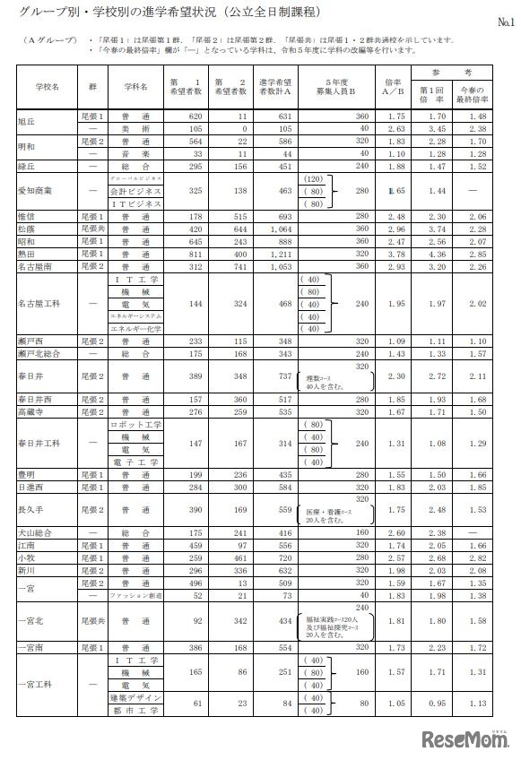 愛知県教育委員会は2022年12月22日、2022年度第2回「中学校等卒業見込者の進路希望状況調査」の結果を公表した。県内公立高校(全日制)への進学希望率は、過去最低となる62.9%。学校・学科別の進学希望試算倍率は、瑞陵(普通)4.50倍がもっとも高かった。