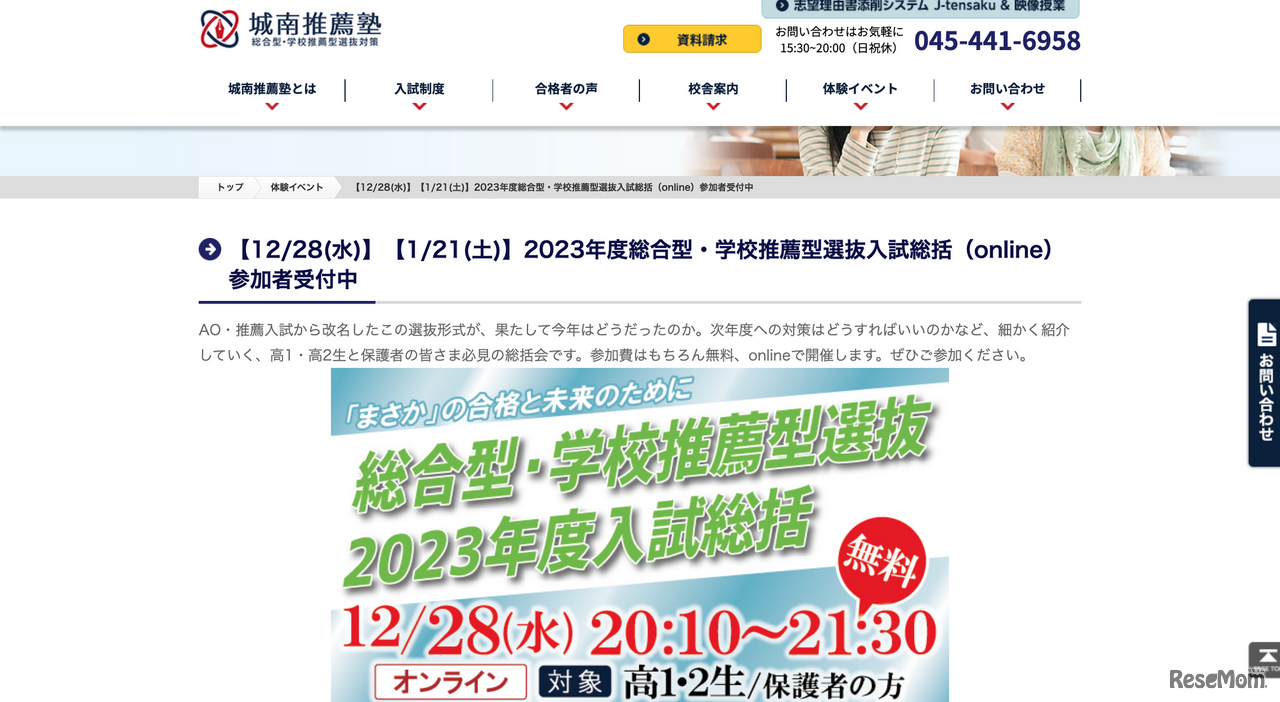 城南進学研究社が運営する「城南推薦塾」では、無料オンラインイベント「2023年度総合型・学校推薦型選抜入試総括」を開催する。日時は2022年12月28日午後8時10分~午後9時30分。対象は高校1・2生とその保護者。参加費無料。