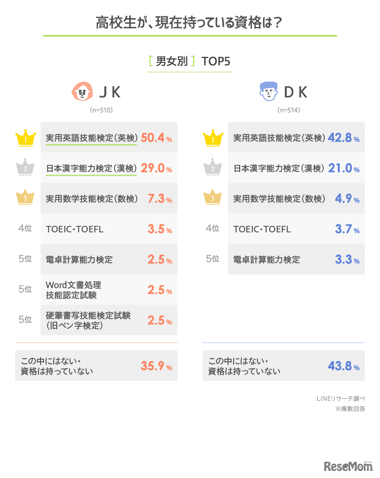 出展:LINEリサーチ 高校生が、現在持っている資格は?[男女別]TOP5