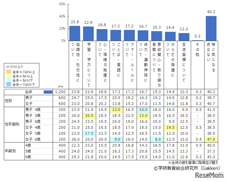 小学校に入学するにあたり他者との関わりや新しい環境への順応に不安を感じている幼児が多いことが学研教育総合研究所の調査結果より明らかになった。また、保護者の約6割が、同世代の子供と比べて気になることが「ある」と回答している。