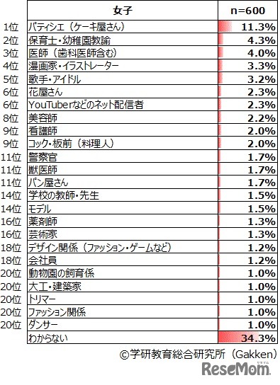 画像出典:学研教育総合研究所 将来つきたい職業(女子)