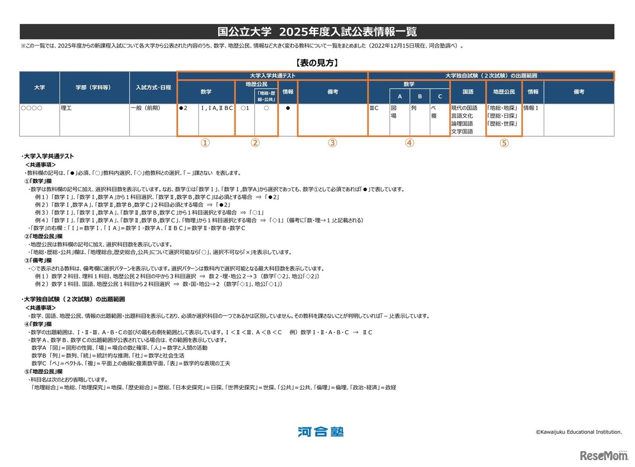 河合塾の大学入試情報サイトKei-Netは、「国公立大2025年度入試公表情報一覧」を掲載。2025年度からの新課程入試について各大学から公表された内容のうち「数学」「地歴公民」「情報」等、大きく変更のある教科についてまとめた(2022年12月15日現在、河合塾調べ)。