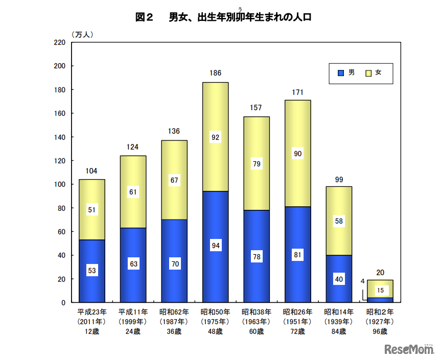 画像出典:総務省 男女、出生年別卯年生まれの人口