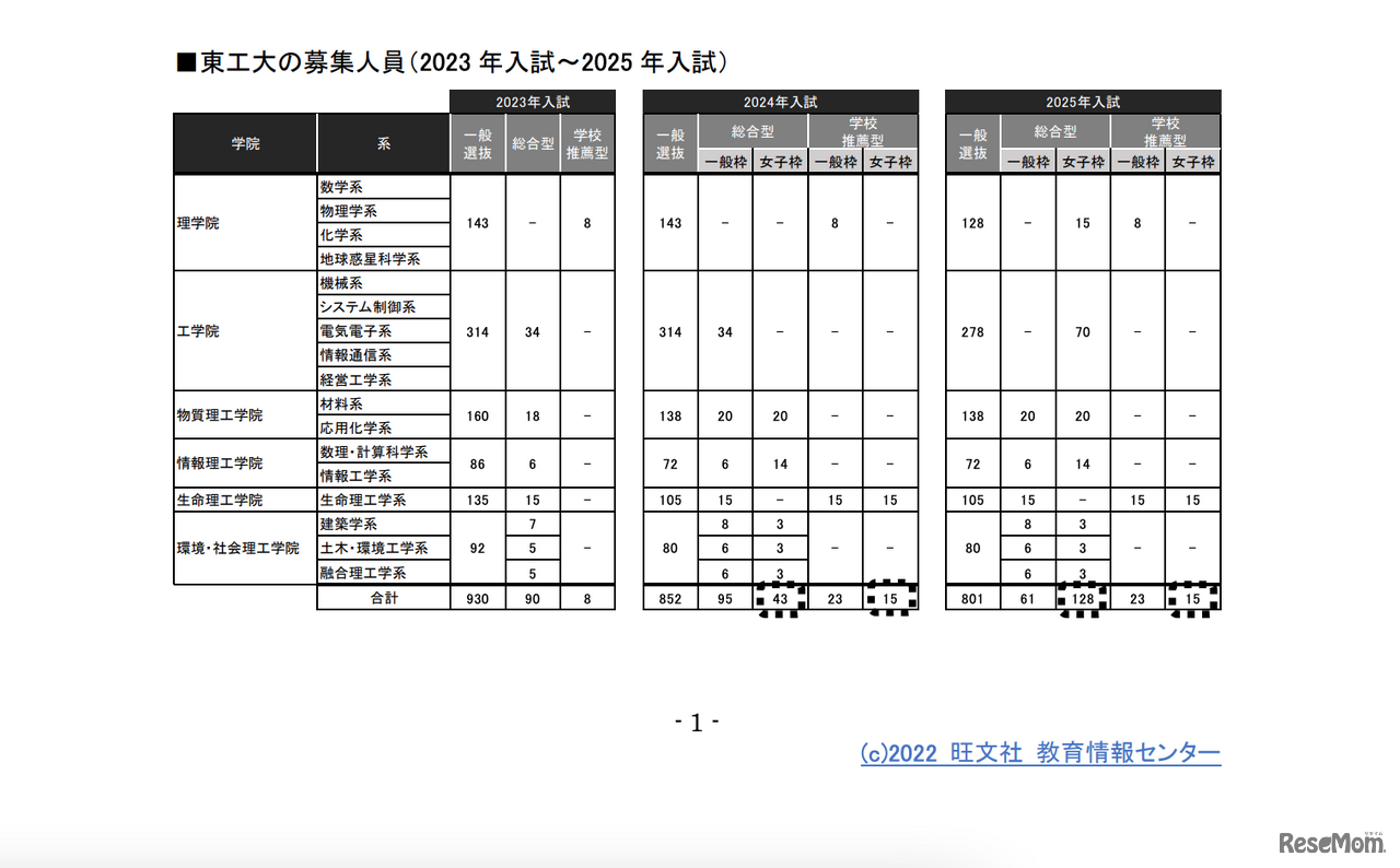 旺文社教育情報センターは2022年12月22日、「大学入試で女子枠を設ける大学が増加」をWebサイトに掲載した。女子枠が設けられるのは、おもに工学部系統、総合型・学校推薦型。東工大の2023年~2025年入試の募集人員等の公表資料をもとに、わかりやすく解説している。