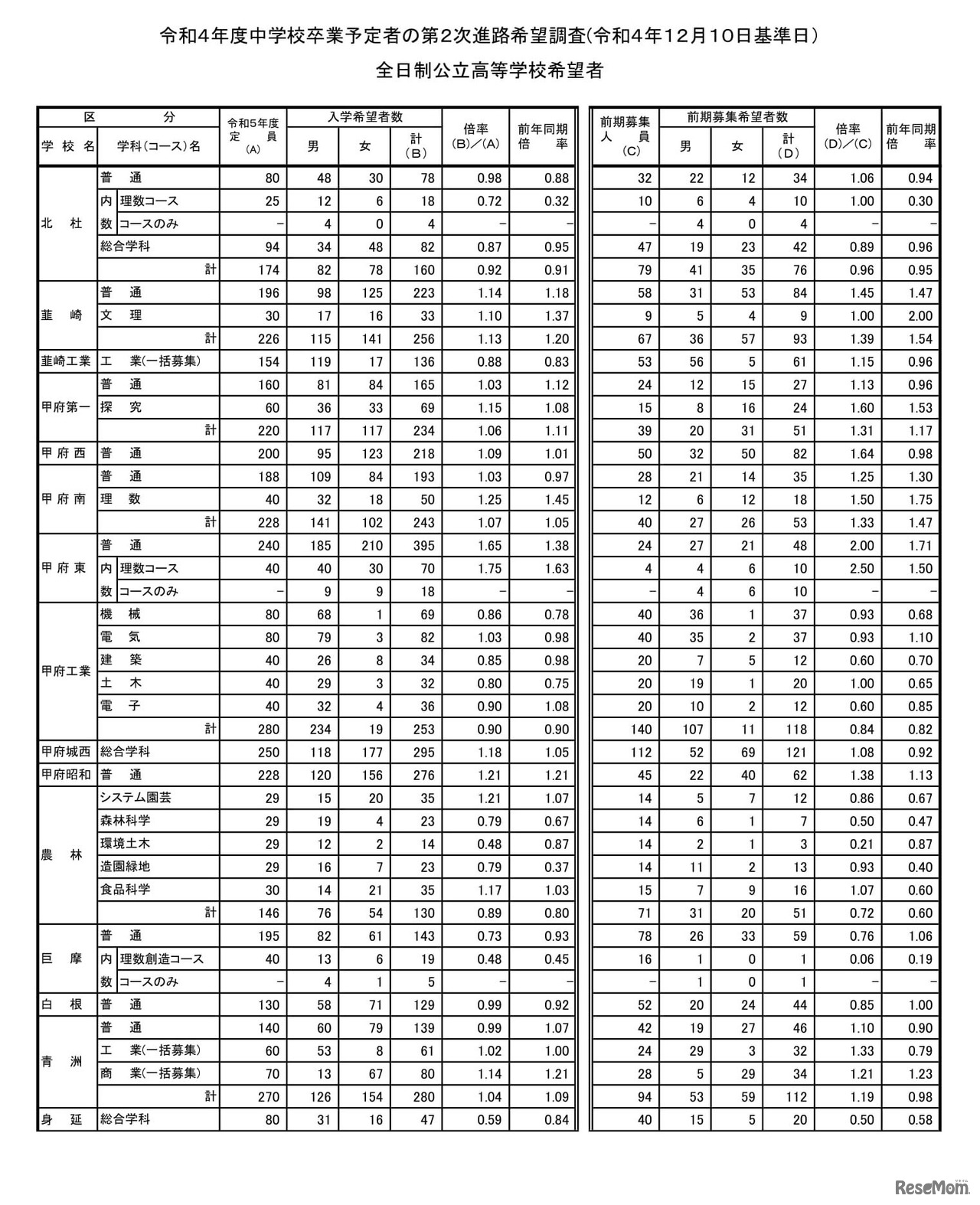 山梨県教育委員会は2023年1月5日、2023年度(令和5年度)中学校卒業予定者の第2次進路希望調査結果の概要を公表した。学校・学科別の希望倍率は、甲府東(普通)1.65倍がもっとも高かった。