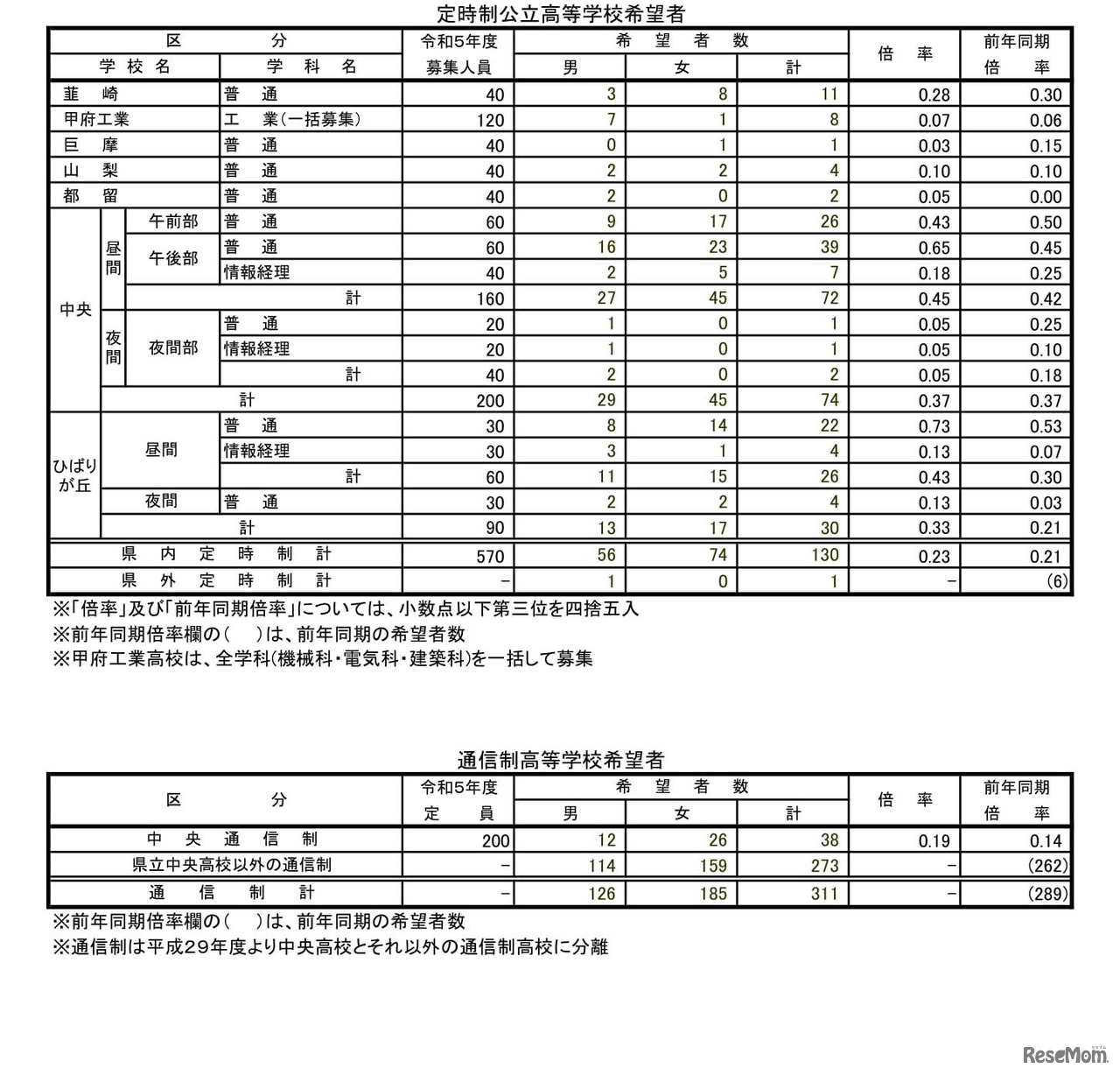 山梨県教育委員会は2023年1月5日、2023年度(令和5年度)中学校卒業予定者の第2次進路希望調査結果の概要を公表した。学校・学科別の希望倍率は、甲府東(普通)1.65倍がもっとも高かった。
