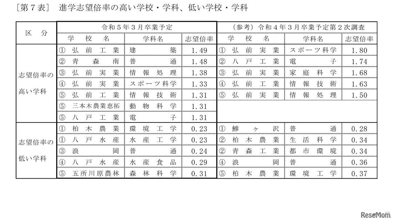 青森県教育委員会は2023年1月5日、県内中学校等卒業予定者の進路志望状況(第2次調査)の結果をまとめた報告書を公表した。学校・学科別の進学志望倍率は、弘前工業(建築)1.49倍がもっとも高く、青森南(普通)1.48倍、弘前実業(情報処理)1.38倍が続いた。