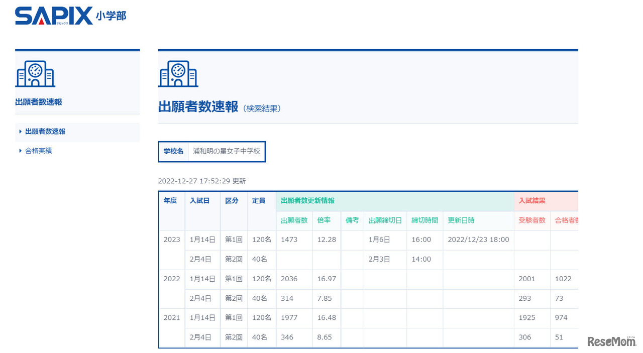 出願者数速報 浦和明の星