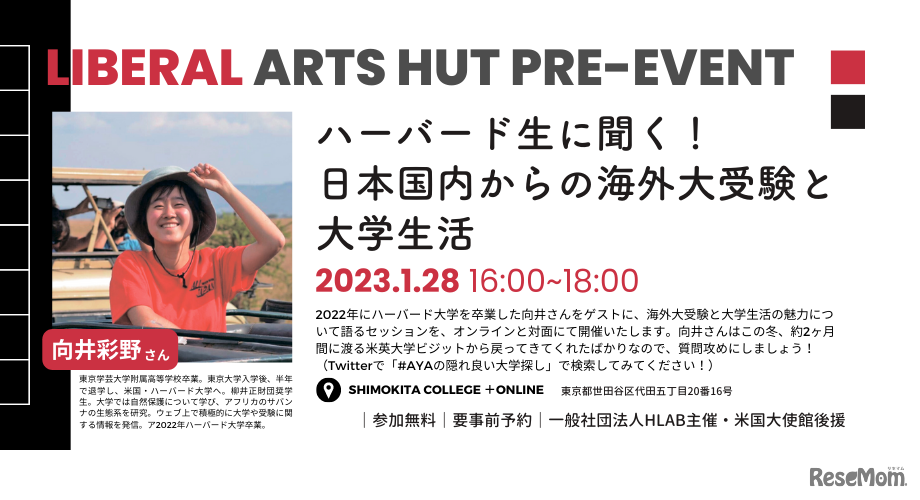 HLABは2023年1月28日、ハーバード大学の卒業生をゲストに迎え、国内からの海外大受験と大学生活についてのトークセッションを無料開催する。申込みはPeatixで受け付ける。チケットは東京会場(数量限定)とオンラインが選択できる。