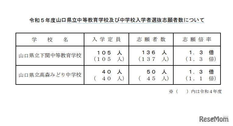 山口県教育委員会は2023年1月10日、県立で中高一貫教育を行う下関中等教育学校と高森みどり中学校の2校の志願者数等を発表した。志願倍率はいずれも1.3倍。選考検査は1月14日に各学校で実施される。