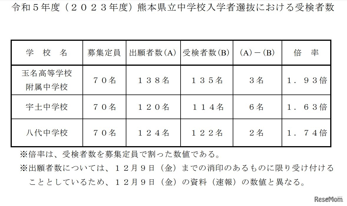 熊本県教育委員会は2023年1月10日、2023年度(令和5年度)県立中学校入学者選抜における受検者数を公表した。1月8日に3校で行われた入学者選抜では、募集定員210人に対し371人が受検。受検倍率は玉名高等学校附属1.93倍がもっとも高かった。