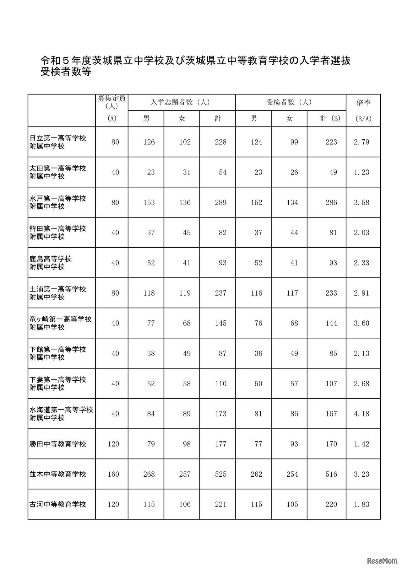 画像出典:茨城県教育委員会 2023年度(令和5年度)茨城県立中学校および茨城県立中等教育学校の入学者選抜受検者数等
