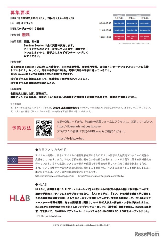 HLABとアメリカ大使館は2023年1月29日、2月4日・5日、中学3年生から高校生を対象に「Liberal Arts HUT」をオンラインで開催、参加者を募集する。参加費無料。