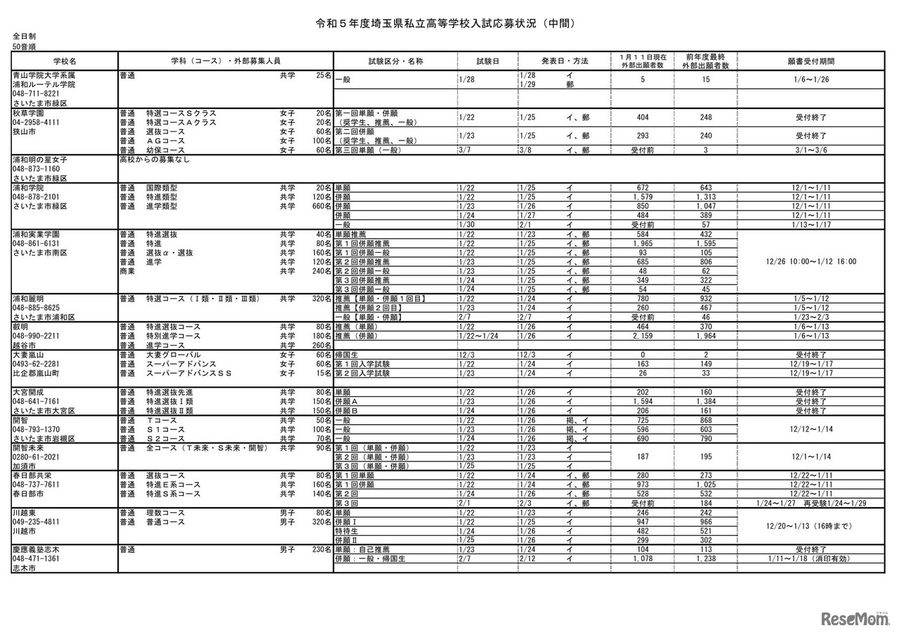 埼玉県は2023年1月14日、2023年度(令和5年度)埼玉県私立高校入試の中間応募状況を公表した。1月11日午後3時時点で、募集人員1万4,539人に対し、応募者数は5万9,558人、平均倍率は4.10倍であった。