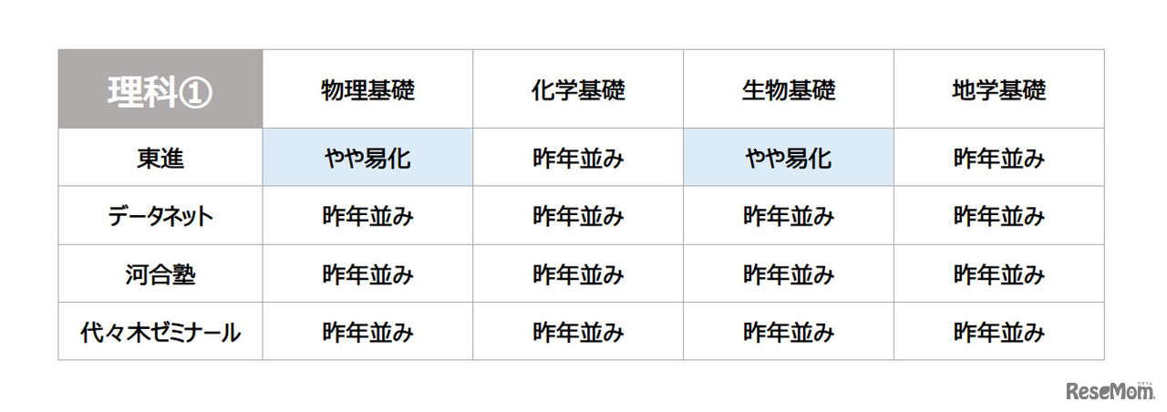 2023年1月15日に実施された大学入学共通テスト(旧センター試験、以下、共通テスト)の理科1(物理基礎/化学基礎/生物基礎/地学基礎)について、東進、データネット(ベネッセ・駿台)、河合塾、代々木ゼミナールが分析した科目別難易度をまとめる。
