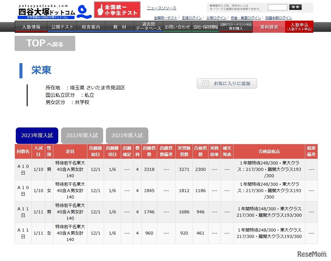 画像出典:四谷大塚 栄東の入試結果一覧(一部)