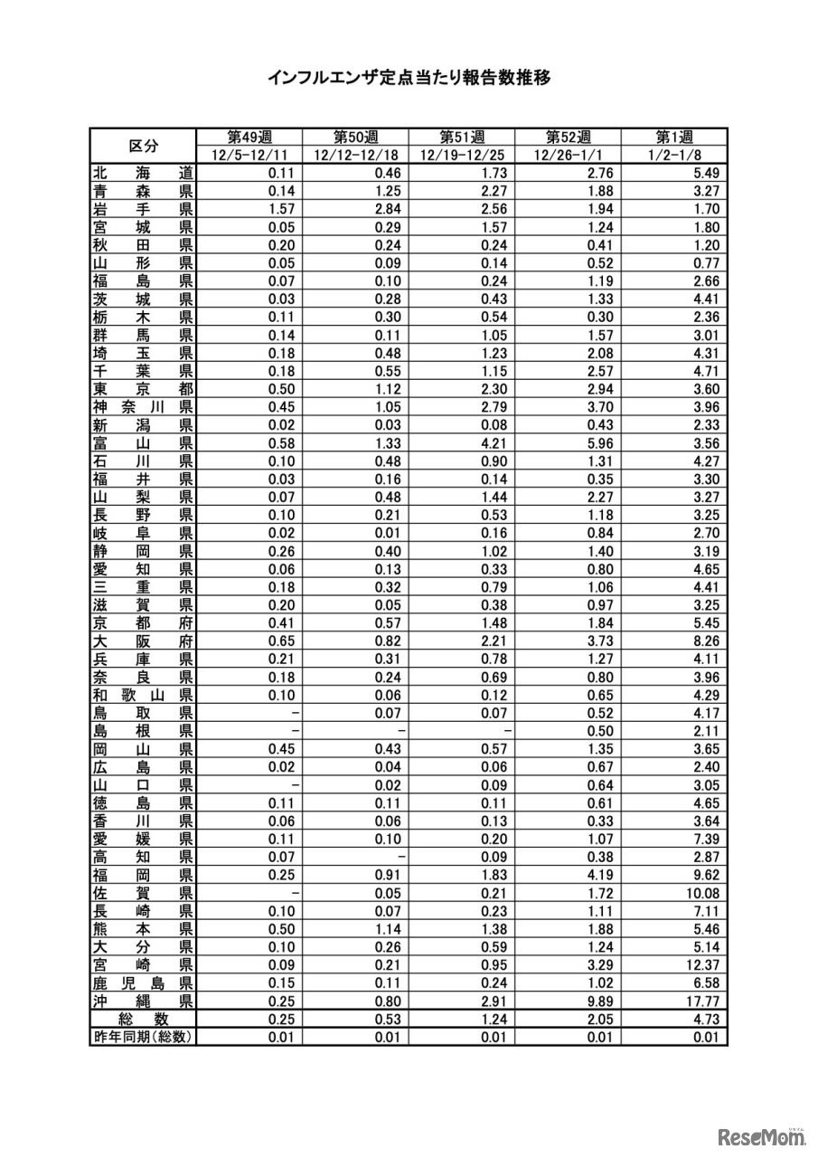 厚生労働省は2023年1月13日、2023年第1週(2023年1月2日~8日)のインフルエンザ発生状況を発表した。定点あたり患者報告数は4.73人。前週の2.05から全国的に増加しており、特に沖縄県、宮崎県、佐賀県では定点あたりの報告数が10を超え、患者数が急増している。