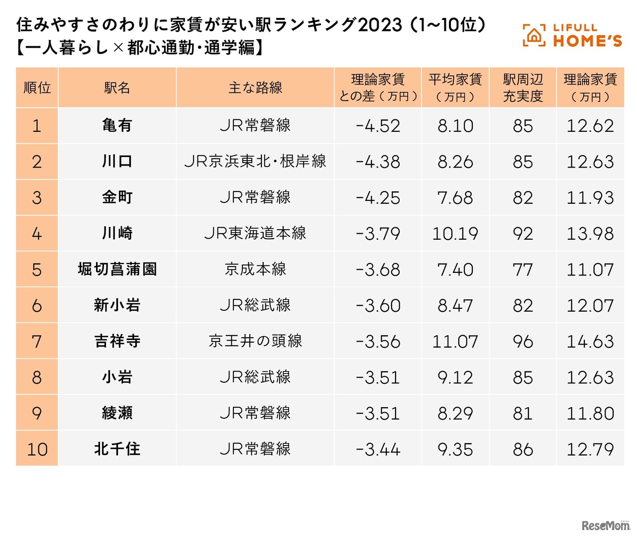 住まいの情報を伝えるサイト「LIFULL HOME'S PRESS(ライフルホームズプレス)」は2023年1月10日、「【一人暮らし×都心通勤・通学編】住みやすさのわりに家賃が安い駅ランキング2023」を発表した。