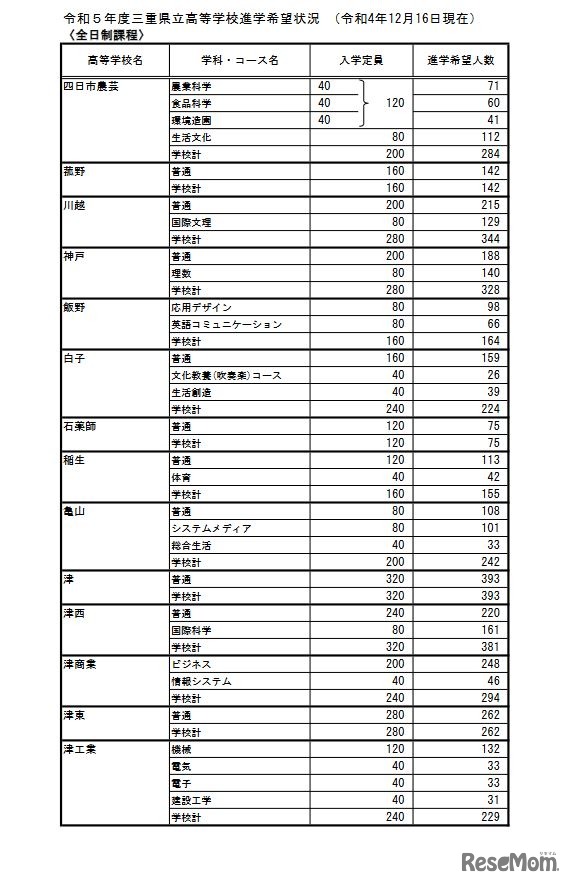 2023年度三重県立高等学校進学希望状況 (2022年12月16日現在)全日制