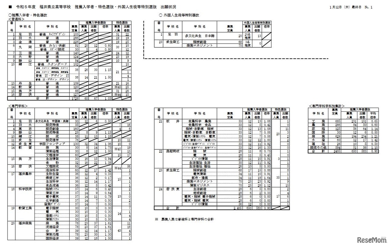 2023年度 福井県立高等学校 推薦入学者・特色選抜・外国人生徒等特別選抜 出願状況