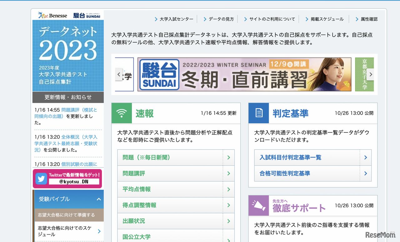 ベネッセコーポレーションと駿台予備学校による「データネット」は、2023年度(令和5年度)大学入学共通テストの予想平均点を1月17日昼に更新した。文系5教科8科目は533点(900点満点)・理系5教科7科目は546点(900点満点)。