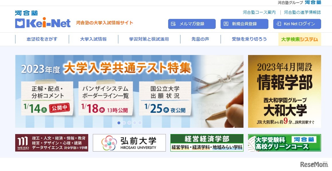 河合塾は2023年1月18日午前9時25分、大学入試情報サイト「Kei-Net」にて、志望校の合格可能性判定ができる「バンザイシステム」と「ボーダーライン一覧」を公開した。各コンテンツが閲覧できない場合は、ブラウザを再読み込みしてもらいたい。