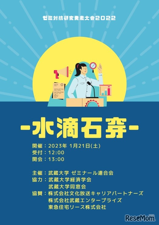 武蔵大学は2023年1月21日、学生団体武蔵大学ゼミナール連合会主催の「ゼミ対抗研究発表大会2022」(ゼミ大会)を武蔵大学江古田キャンパスで開催、公開する。入場無料。予約不要。