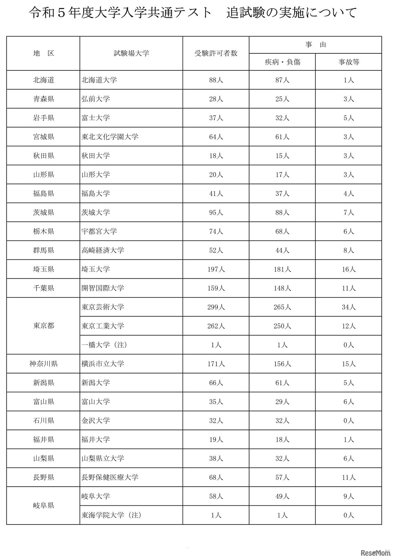 大学入試センターは、2023年度(令和5年度)大学入学共通テスト(以下、共通テスト)の追・再試験受験対象者について、2023年1月18日午後2時現在の状況を発表した。対象者は、追試験が3,889人、再試験が393人。