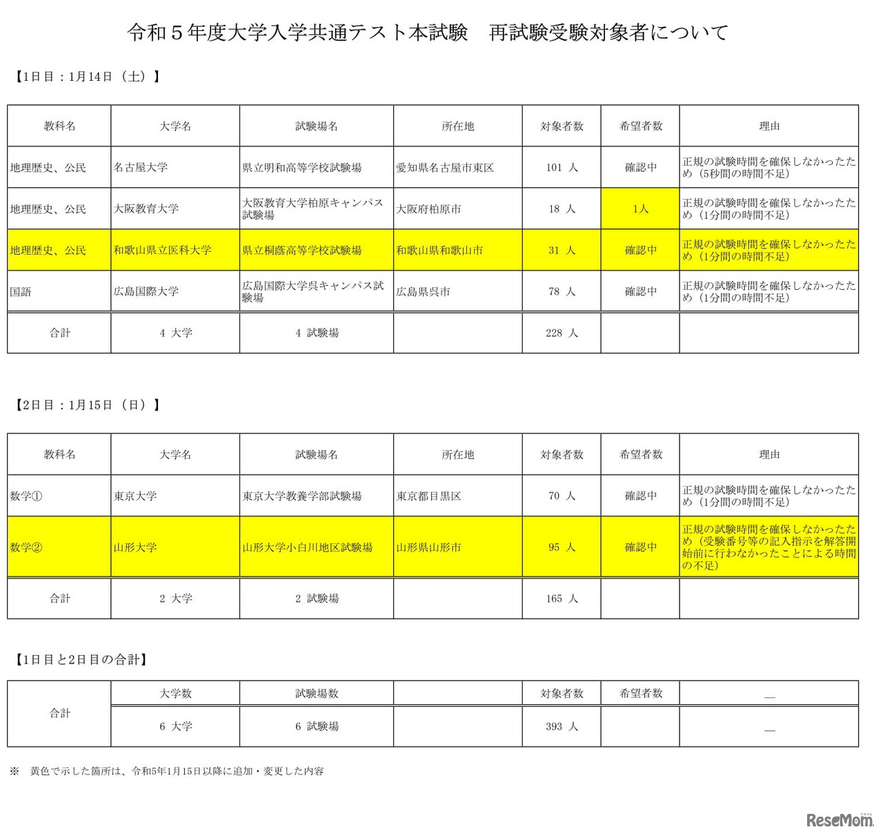 大学入試センターは、2023年度(令和5年度)大学入学共通テスト(以下、共通テスト)の追・再試験受験対象者について、2023年1月18日午後2時現在の状況を発表した。対象者は、追試験が3,889人、再試験が393人。