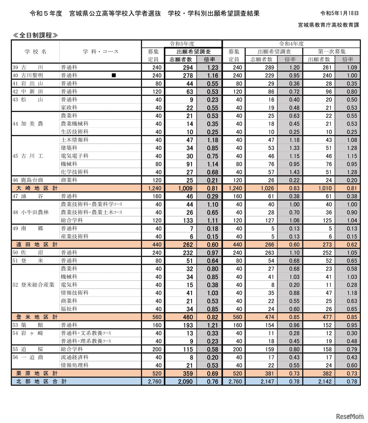 宮城県教育庁は2023年1月18日、2023年度(令和5年度)宮城県公立高等学校入学者選抜に係る出願希望調査結果を公表した。全日制課程68校の平均志願倍率は1.02倍で、学校別では仙台南(普通)2.06倍、仙台一(普通)1.89倍等が高い。