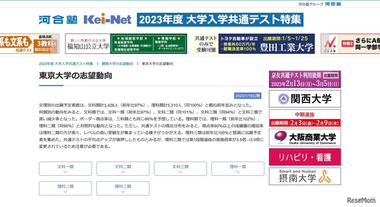 河合塾は2023年1月18日、2023年度(令和5年度)大学入学共通テスト(以下、共通テスト)における「難関大学の志望動向」を公開した。東京大学や京都大学等の難関国立10大学について、志望動向や予想ボーダー得点等を分析している。