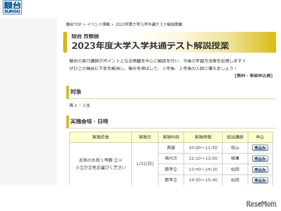 駿台予備学校は2023年1月22日から2月5日、「大学入学共通テスト解説授業」を首都圏の校舎にて行う。対象は、高1・2年生。解説授業では、ポイントとなる問題を解説する他、今後の学習方法等も伝授する。事前申込制。参加無料。