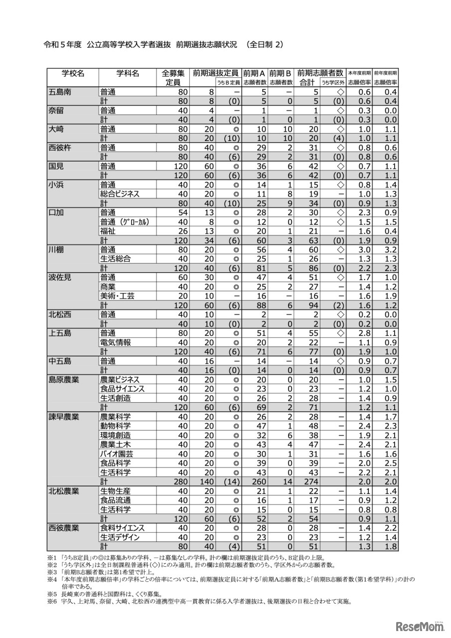 画像出典:長崎教育委員会「令和5年度公立高等学校入学者選抜 前期選抜・離島留学特別選抜志願状況について」 令和5年度 公立高等学校入学者選抜 前期選抜志願状況(全日制2)
