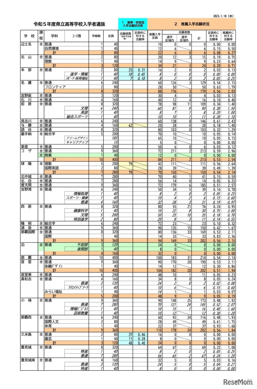 沖縄県教育委員会は2023年1月18日、2023年度(令和5年度)沖縄県立高等学校入学者選抜推薦入学の志願状況を公表した。全日制課程の推薦入学志願倍率は1.02倍。