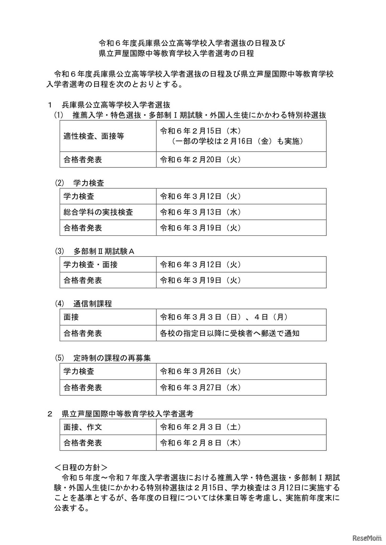 兵庫県教育委員会は2023年1月19日、令和6年度(2024年度)兵庫県公立高等学校入学者選抜の日程を発表した。学力検査は2024年3月12日、総合学科の実技検査は3月13日に実施する。また、県立芦屋国際中等教育学校入学者選考の日程も発表された。