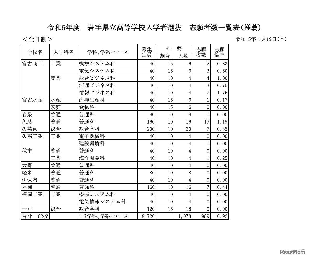 岩手県教育委員会は2023年1月19日、2023年度(令和5年度)岩手県立高等学校入学者選抜推薦入学者選抜の志願者数一覧を公表した。全日制課程62校の推薦入学志願倍率は0.92倍。