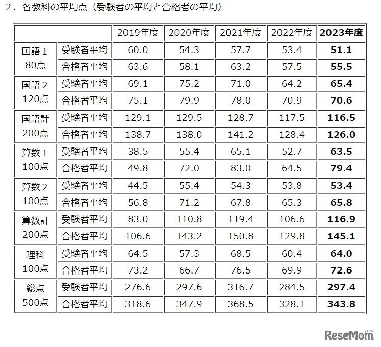 画像出典:灘中学校・灘高等学校 灘中学校 入試資料 (2019~2023年度)各教科の平均点