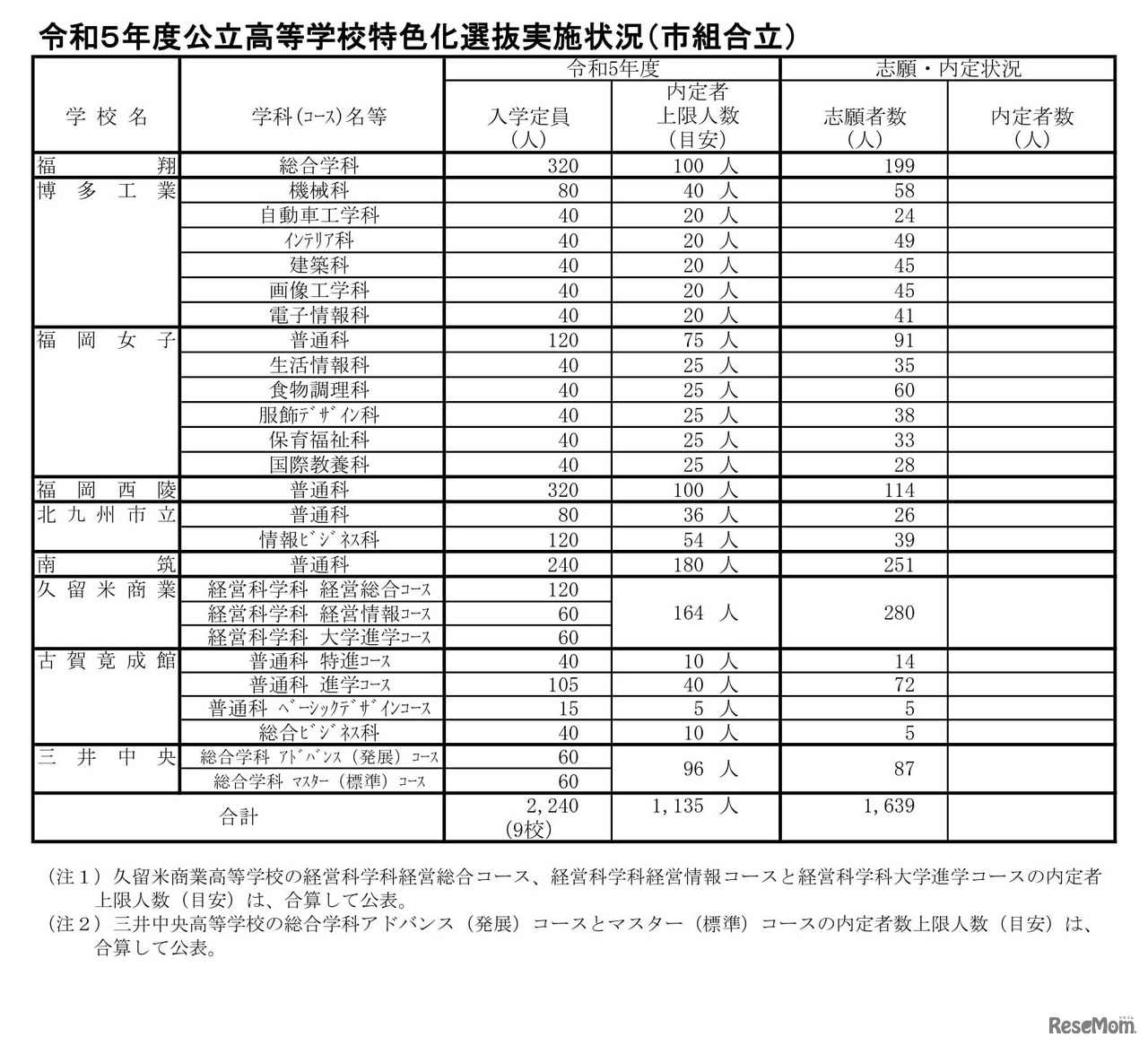 画像出典:福岡県 2023年度(令和5年度)公立高等学校特色化選抜実施状況(市組合立)