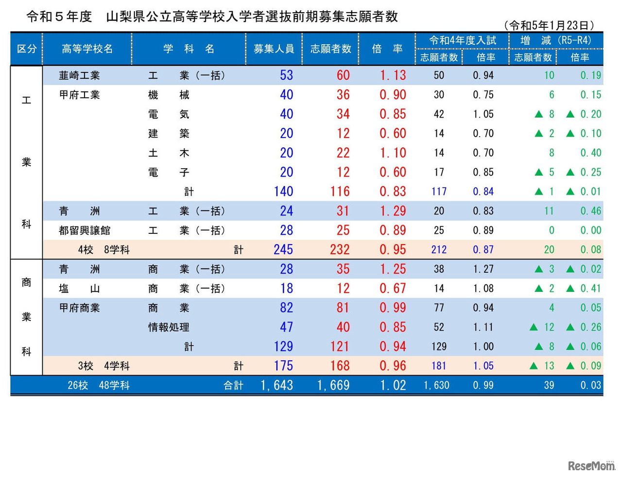 山梨県教育委員会は2023年1月23日、2023年度(令和5年度)入学者選抜前期の志願者数について発表した。全日制課程26校の平均志願倍率は1.02倍。学校別では吉田(理数)2.67倍がもっとも高かった。