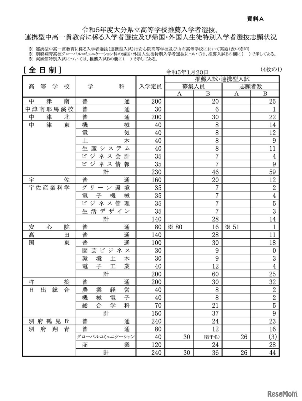画像出典:大分県教育委員会「令和5年度大分県立高等学校推薦入学者選抜、連携型中高一貫教育に係る入学者選抜および帰国・外国人生徒特別入学者選抜志願状況」 全日制の志願状況