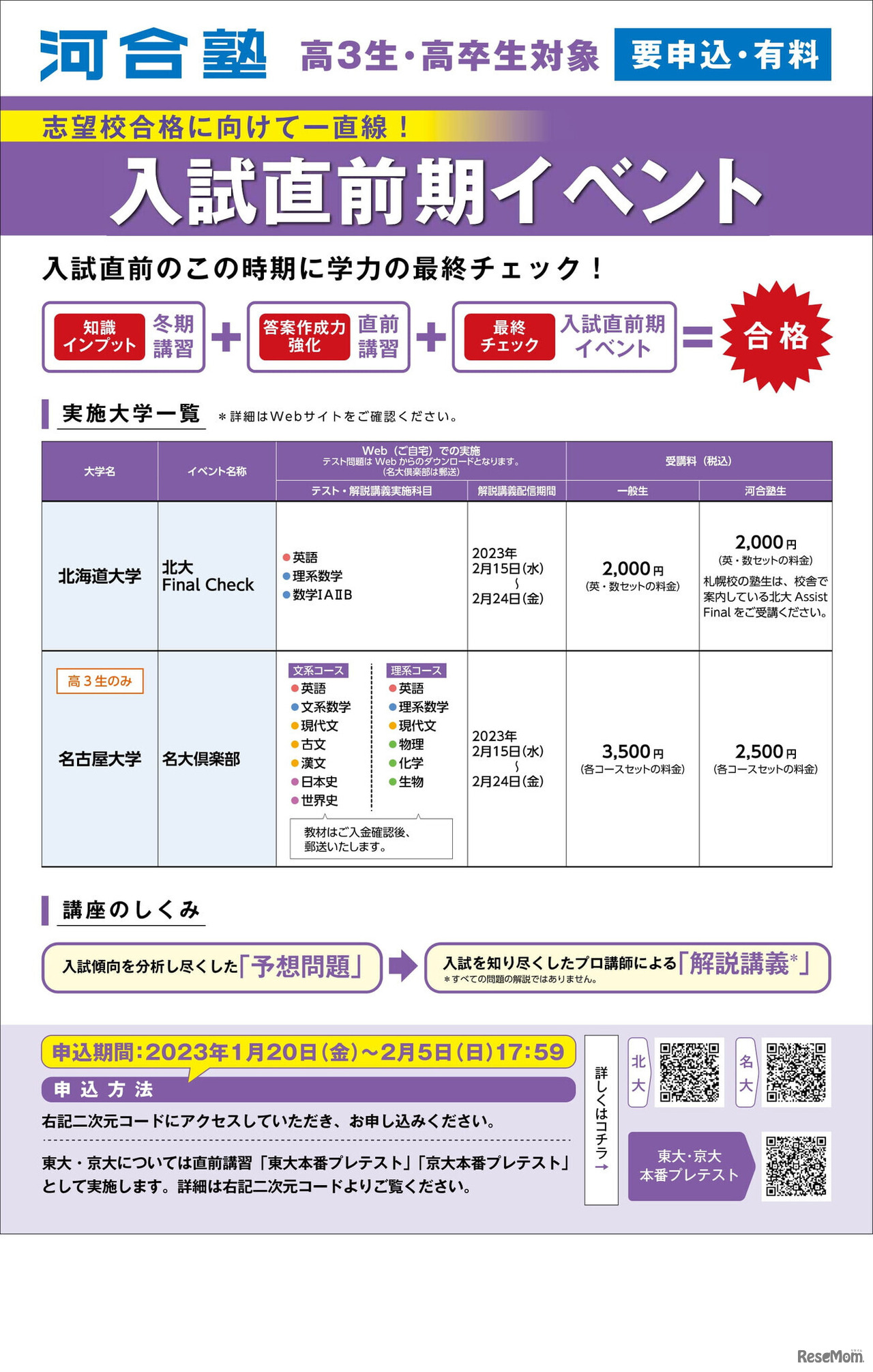 河合塾は、高3生・高卒生を対象に「難関大 入試直前期イベント(有料)」を現地とオンラインで開催する。2023年2月4日の広島大を皮切りに、九州大、北海道大、東北大、名古屋大の5校を対象に、予想問題とプロ講師による解説講義を行う。事前申込制。