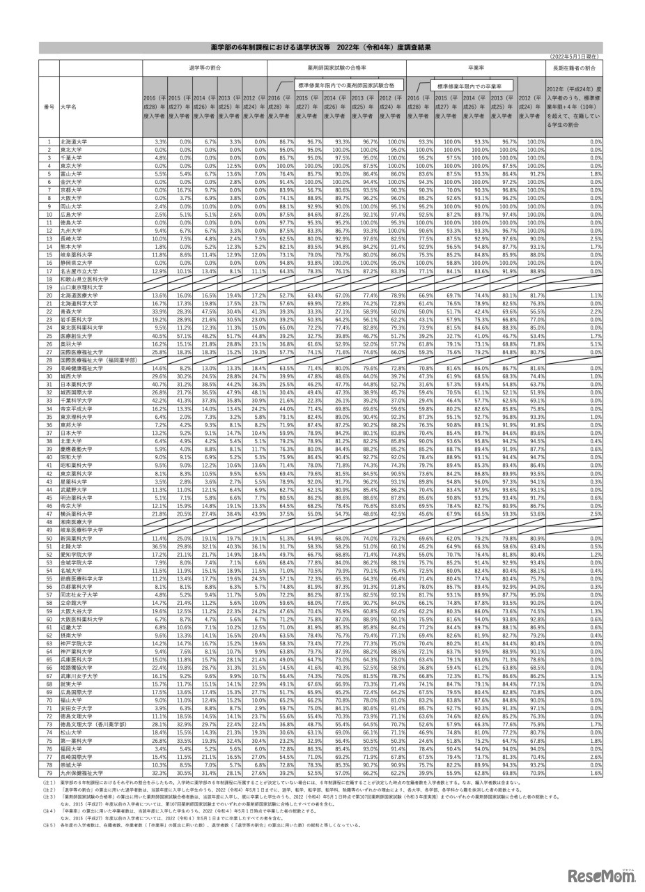 文部科学省は2023年1月23日、全国の薬学部における2022年度の修学状況および退学状況等の調査結果を発表した。2016年度入学生(2022年度卒業生)の退学率は、東北大、東京大、京都大等、国公立7大学が0%。私立大学では、福岡大3.4%がもっとも低かった。