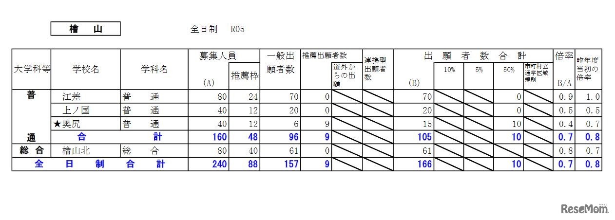 画像出典:北海道教育委員会「令和5年度公立高等学校入学者選抜の出願状況(令和5年1月23日正午現在の数)」 檜山学区