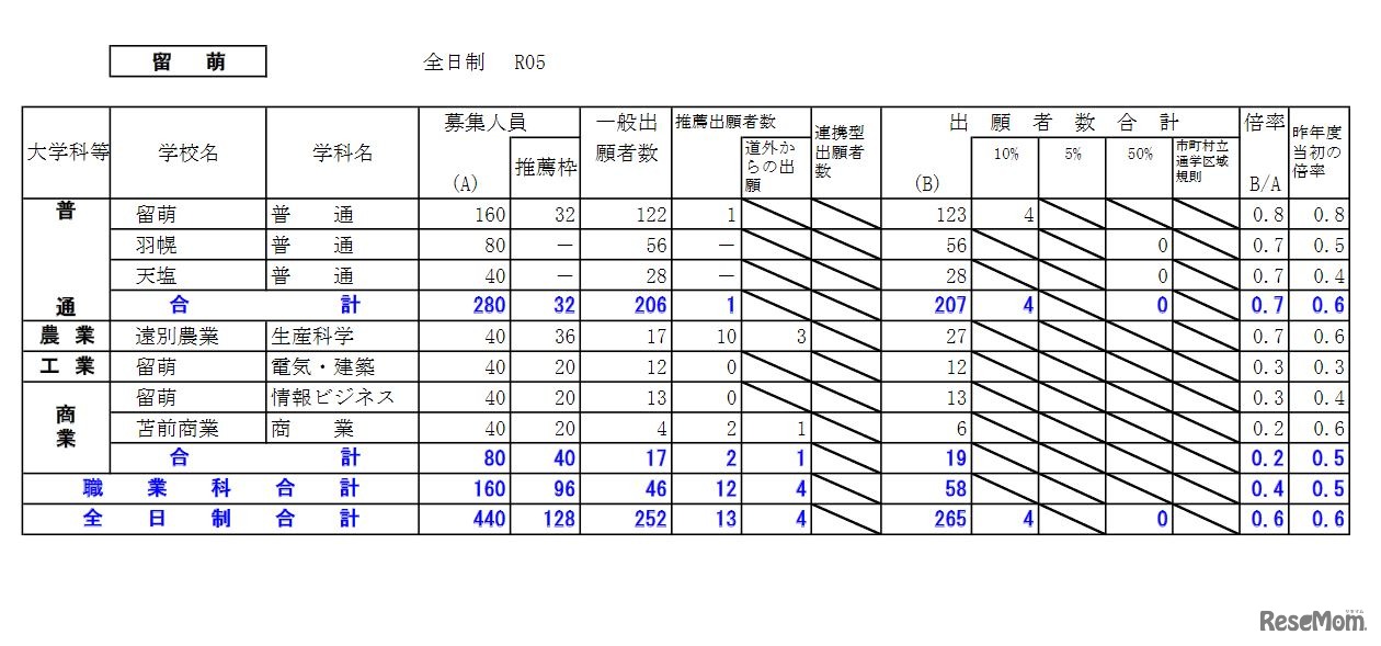 画像出典:北海道教育委員会「令和5年度公立高等学校入学者選抜の出願状況(令和5年1月23日正午現在の数)」 留萌学区