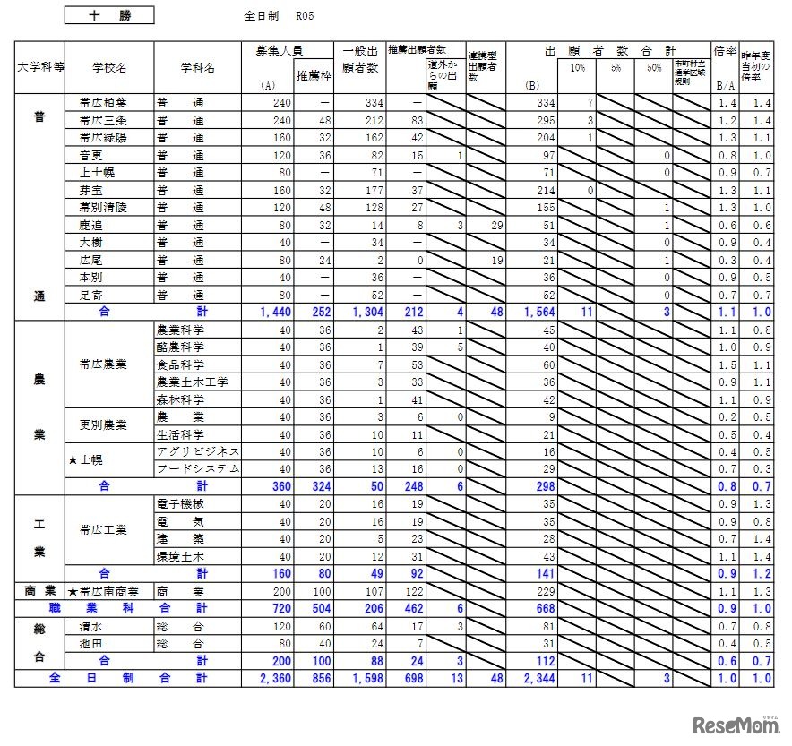 画像出典:北海道教育委員会「令和5年度公立高等学校入学者選抜の出願状況(令和5年1月23日正午現在の数)」 十勝学区